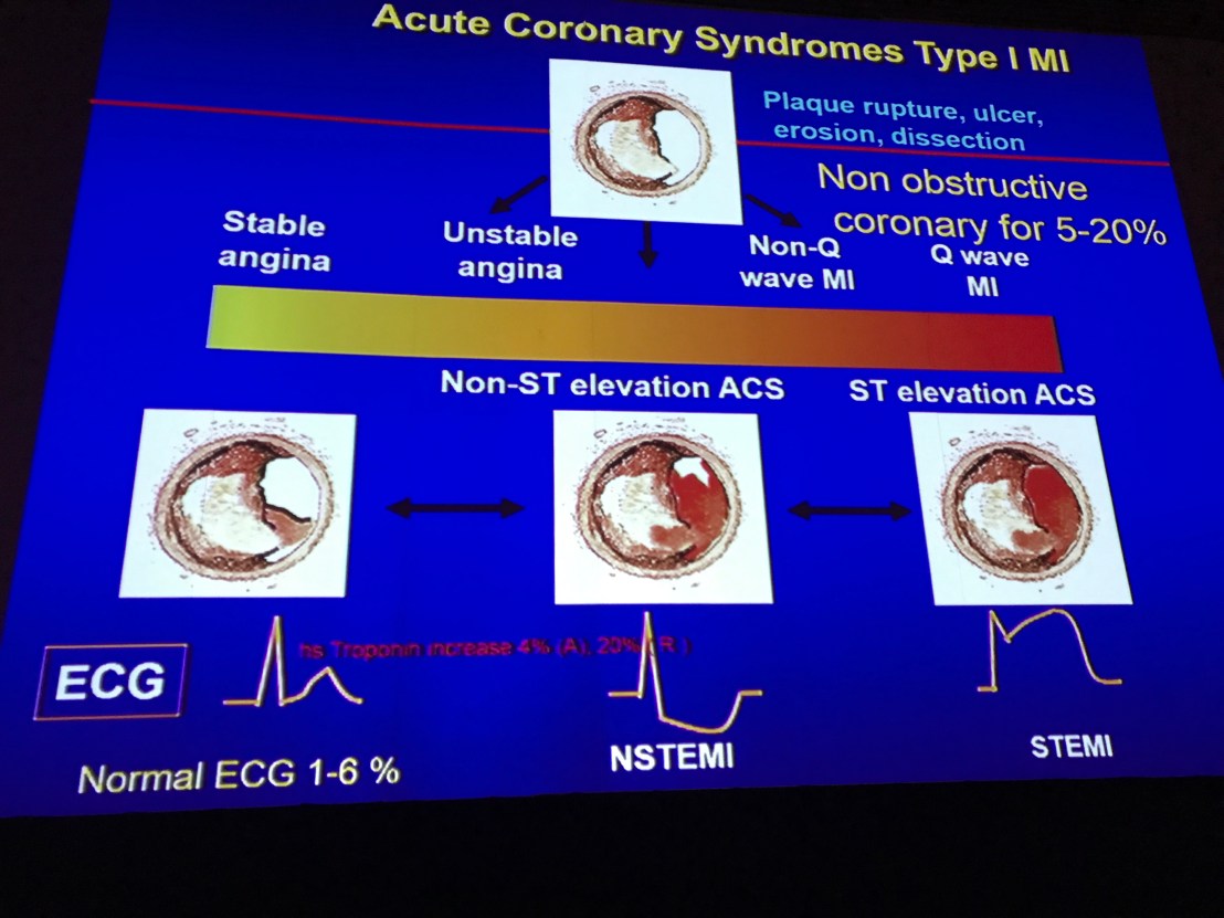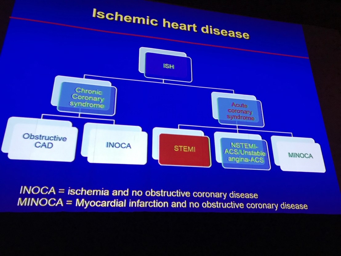 ทำความรู้จักกับอย่างแรก คือ Acute coronary syndrome จะมี STEMI (ST segment elevation MI), Non-STEMI, ส่วน MINOCA คือ Pt ที่มีอาการเหมือน Acute MI เช่น chest pain, เป็นลม หมดสติ, Cardiac enzyme และ EKG ผิดปกติ แต่ Coronary angiogram ฉีดสีดันออกมาปกติ (—> coronary artery normal หรือ insigficant coronary artery disease)