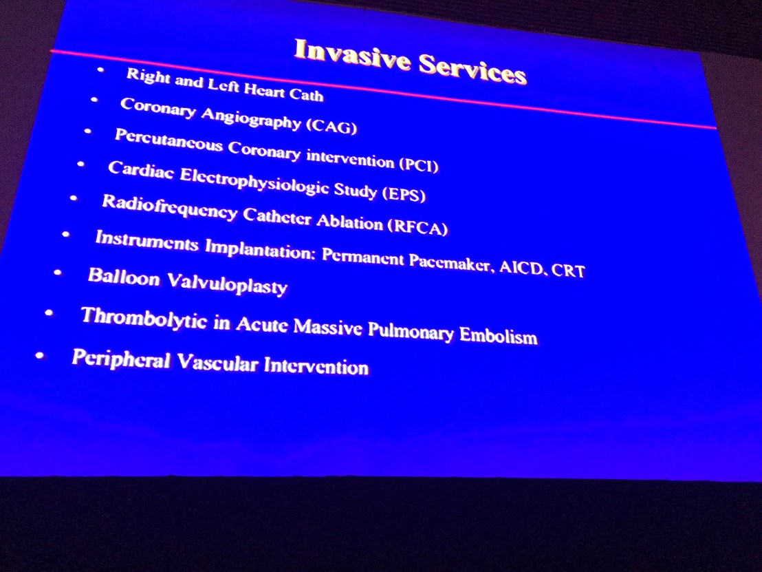 ที่พูดมาทั้งหมดคือ Non invasive test ทั้งหมดที่หมอ Cardio จะทำได้ในแต่ละโรค ต่อไปจะพูดถึง Invasive service (คือ พวกสวนหัวใจต่างๆ ที่จะทำหลัง CT Scan ยกเว้นใน case ที่เราต้องทำ balloon แน่นอน จะไม่ต้องทำ CT เช่น case ที่จัดอยู่ใน Acute coronary syndrome ส่วนใหญ่จะไม่ส่ง CT เพราะเรารู้ว่ามีโอกาสที่ต้องทำ balloon และสวนหัวใจอยู่แล้ว)
