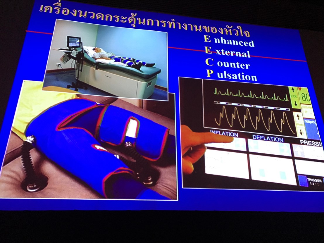 และถ้า Pt ทำ balloon ไม่ได้, ทำ Bypass ไม่ได้ เราก็จะนำ Pt มาทำ EECP คือ การ push เลือดขึ้นไปเลี้ยงหัวใจ ในช่วงที่หัวใจคลายตัว แล้วดึงเลือดออกมา ในช่วงที่หัวใจบีบตัว เป็น pump ให้หลอดเลือดเล็กๆ เปิดขยาย