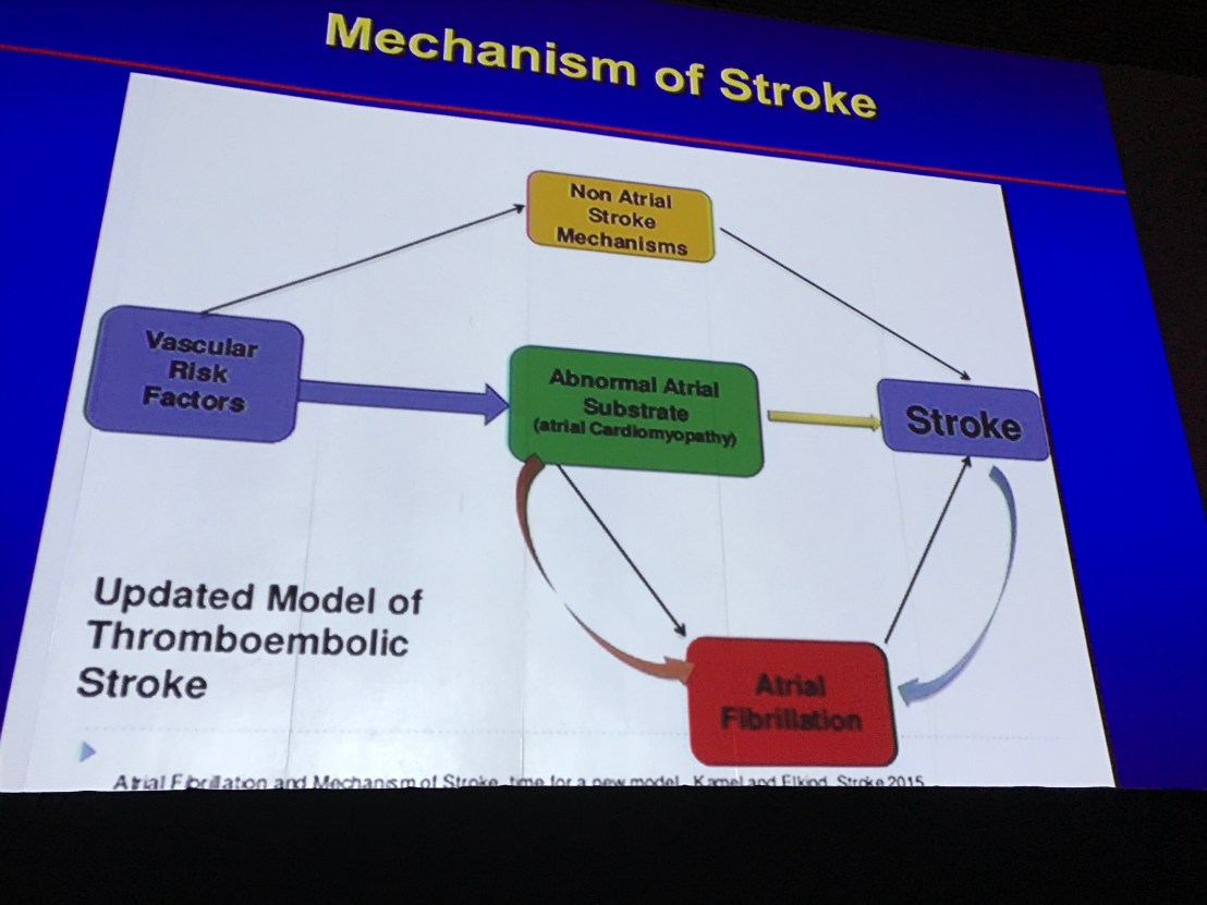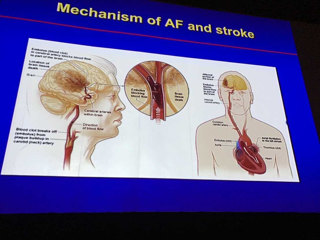กลไกคือ เมื่อร่างกายมี AF คือหัวใจเต้นรัว พอกลับมาเต้นปกติจะทำให้เกิด clot ไปติดบริเวณที่เป็นทางแยกหรือไม่เรียบ ต่อมาเมื่อหัวใจ recover จาก AF กลับมาเต้นปกติ clot จะ flow ไปที่ brain ทำให้เกิด block–> Stroke