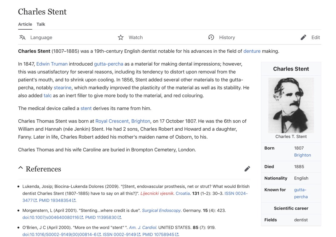 และคำว่า stent ก็มาจากชื่อของ Dr. Charles Stent ซึ่งเป็นทันตแพทย์เช่นกัน ที่เป็นผู้คิด slot หรือ tube นี้ขึ้นมา จึงใช้คำนี้เรียก โครงเหล็กที่ใส่เป็นโครงค้ำยันในหลอดเลือด coronary