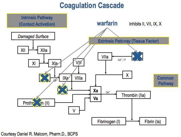 แต่ VKAs เช่น Warfarin จะไป inhibit ใน Extrinsic pathway และ Common pathway (Common pathway เป็นจุดที่ Intrinsic และ Extrinsic pathway มาบรรจบกัน) จึงสามารถตรวจ INR ได้