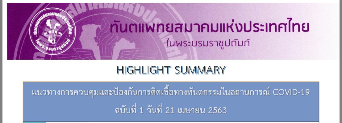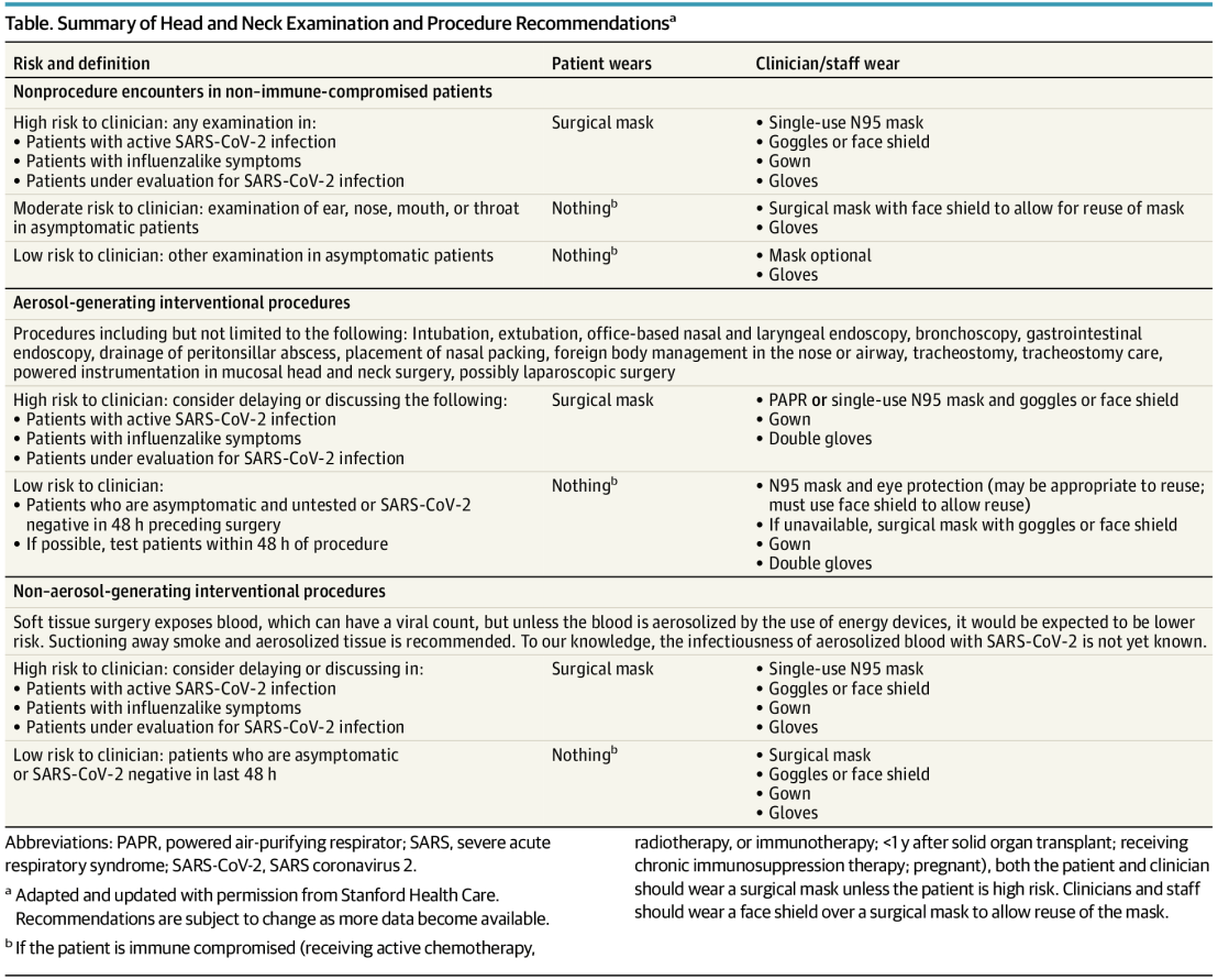 แสดงให้เห็นว่า ถ้ามี Precautions ที่ดี ทำให้ HCWs ทำงานได้อย่างปลอดภัย แต่ปัจจุบันยังไม่มี Protocols สำหรับการตรวจและการรักษาพื้นฐานใน ENT (head&neck exam, endoscopy ของ nose,sinuses,larynx,tracheostomy etc.)แต่จะเป็นในลักษณะที่แต่ละ field ไปสร้าง guideline กันเอง (เหมือนที่ทันตแพทยสมาคมสร้างสำหรับทันตแพทย์)