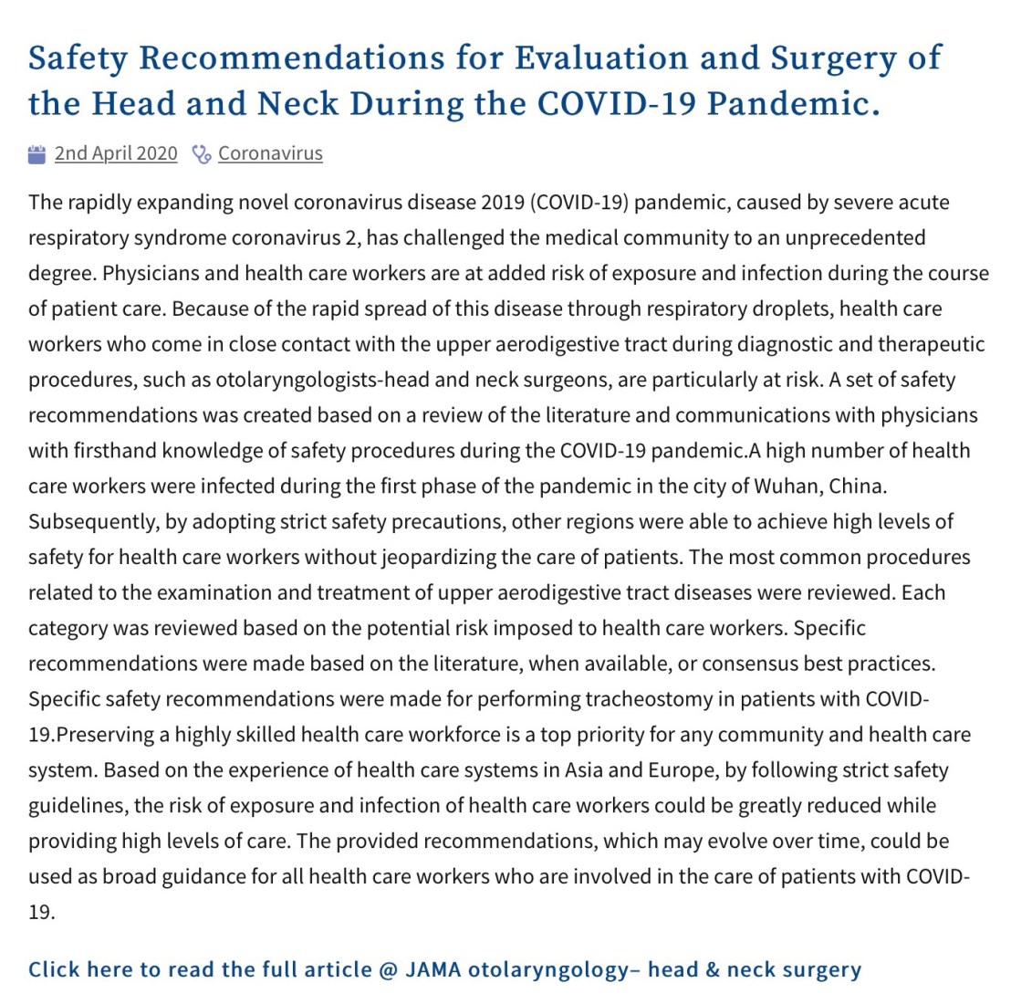 เนื่องจาก ENT ต้องทำงานใน upper aerodigestive tract จากการตระหนักถึงการติดเชื้อใน HCW ของการระบาดในช่วงแรก ( มกราคม 2020) ใน Wuhan จึงทำให้เกิด strict safety precautions ตามมา ในงาน ENT ยกตัวอย่างเช่น การทำ Tracheostomy ในผู้ป่วยที่เป็น C0VID-19 ถือว่าเป็นงานที่มีความเสี่ยงสูงมาก