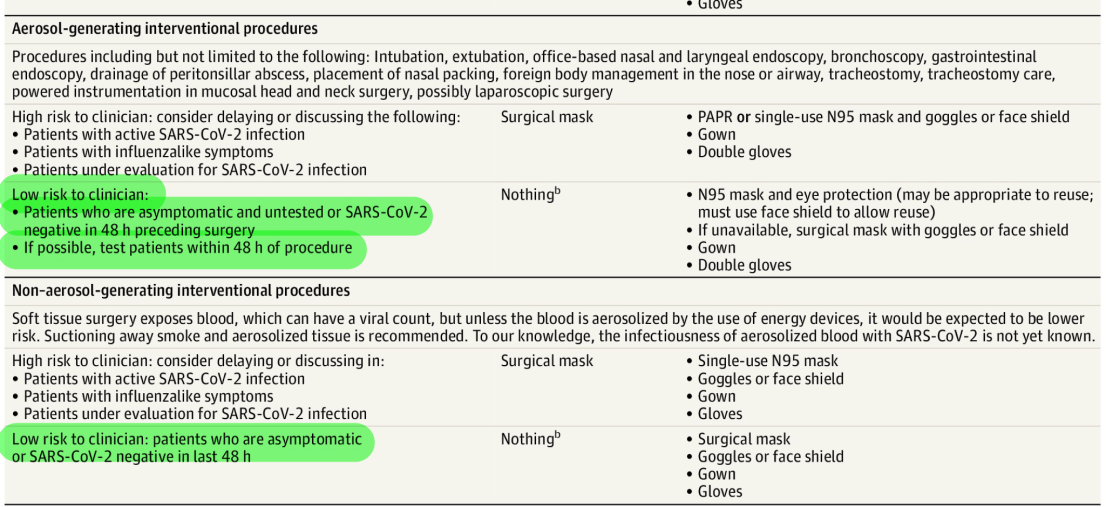 – ใน Operation room ให้ลด staff ที่ไม่เกี่ยวข้องโดยตรงให้มากที่สุด และถึงแม้ในผู้ป่วยที่ตรวจแล้ว negative COVID หรือไม่ทราบ COVID status และ asymptomatic แต่ถ้าเป็น high-risk operation การเลือกใช่ PPE ต้องจัดเต็มครับ เพราะ การตรวจ COVID ไม่ครอบคลุมคนทั้งหมด ทำให้ prevalence ของโรคนี้มักไม่ใช่ตัวเลขของผู้ติดเชื้อจริงในชุมชนนั้นๆ (หมายความว่า อาจเจอ false negative ได้สูง)