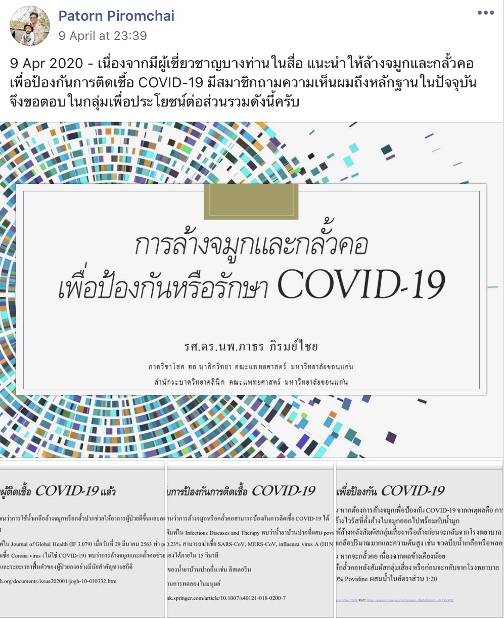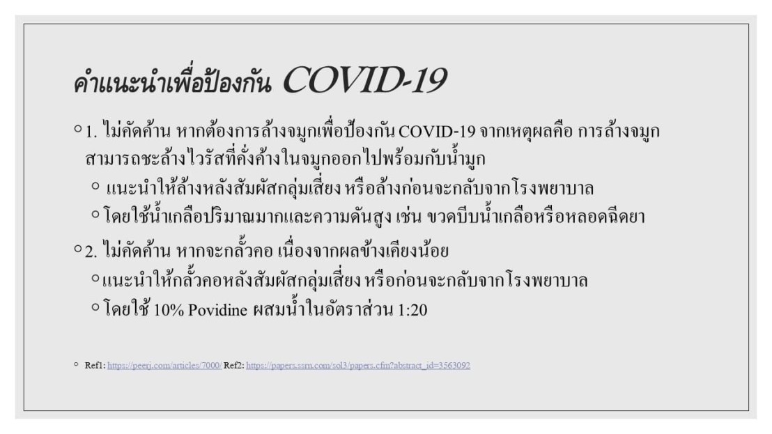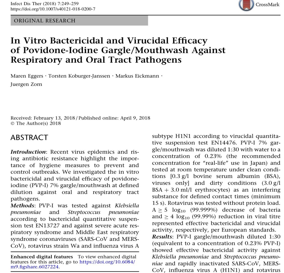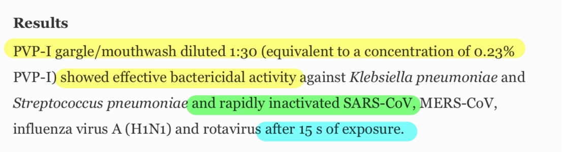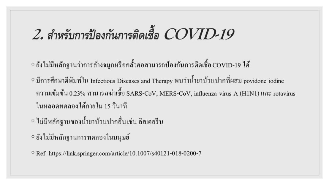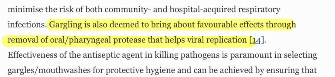 –จุดประสงค์ในการเน้นไปที่การกลั้วคอ (มากกว่า mouth rinse) สำหรับการฆ่าเชื้อ respiratory virus ก็เพราะต้องการผลของ Povidone iodine ไปยับยั้ง Protease enzyme ที่คอ (เรารู้ว่า มันจะไป replication ที่นั่น มากกว่าในปาก)