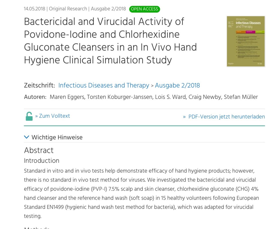 เทียบระหว่าง PVP-I 7.5%, CHX 4% และน้ำสบู่ ต่อการฆ่าเชื้อ E. coli (เลือกตามมาตรฐาน EN1499, ปลอดภัยในการทดสอบภายนอกร่างกาย) และ MNV (murine norovirus) ที่เลือกใช้ virus ตัวนี้เพราะไม่ก่อให้เกิดโรคในมนุษย์ (การทดลองทำในอาสาสมัคร 15 คน ทดสอบก่อนและหลังล้างมือด้วย anticeptic)