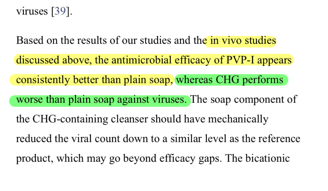 ผลการศีกษาพบว่า ทั้ง PVP-I และ CHX สามารถทำลาย E.coli ได้อย่างไม่มีปัญหาครับ แต่ฤทธิ์ในการฆ่า virus (MNV) นั้น PVP-I ทำได้ดีที่สุด รองลงมาคือ น้ำสบู่ และ CHX ทำลาย virus ได้น้อยที่สุดครับ
