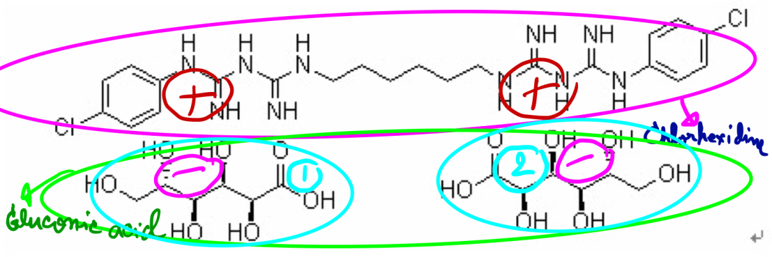 ดังนั้นเมื่อ Gluconic acid แตกตัวออกไปเป็น Gluconic ion ประจุลบ 2 โมเลกุล จึงทำให้ Chlorhexidine (CHX) ที่เหลือกลายเป็นสาร 1 โมเลกุลที่มีประจุบวก 2 ตำแหน่ง ในที่สุด