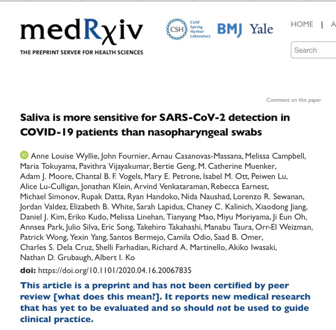 มี paper ศึกษา Sensitivity ของการตรวจ specimens ด้วยน้ำลาย เทียบกับ nasopharyngeal swab เพื่อจะดูว่า สามารถนำน้ำลายมาตรวจแทนการ swab ได้มั๊ย?