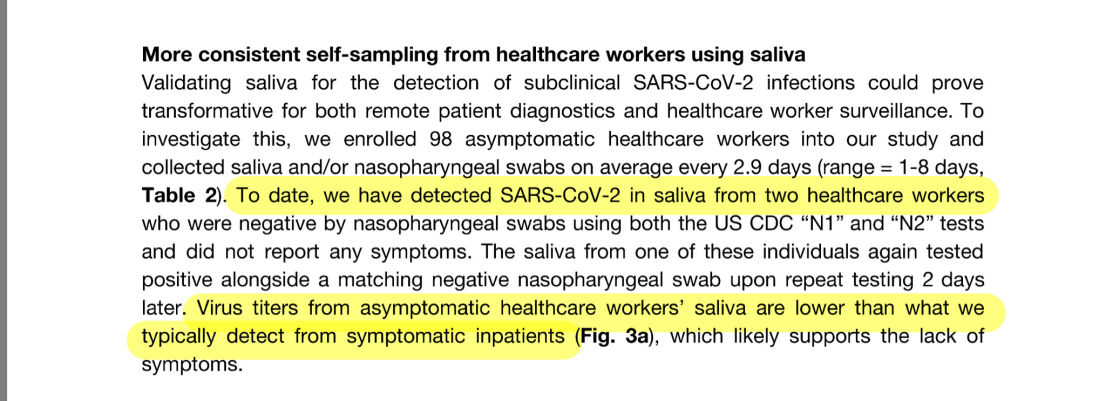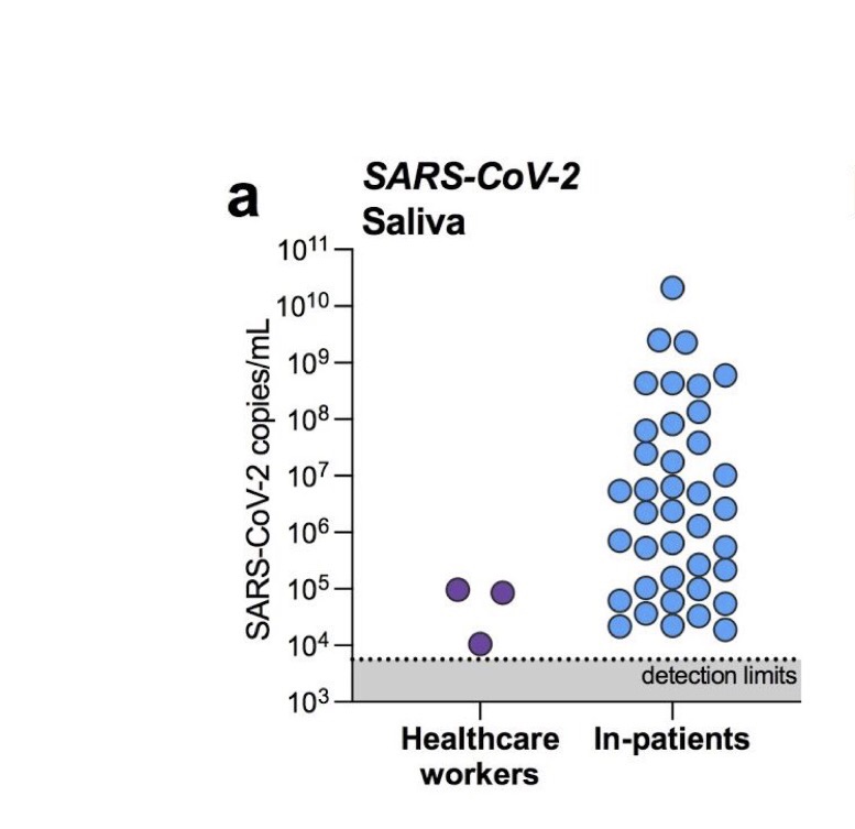 ที่น่าสนใจคือ กลุ่มที่ 2 ครับ พูดง่ายๆ คือ เป็นการตรวจ HCW ที่คาดว่า ไม่น่าจะมีอะไรนะ แต่ผลที่ออกมา surprise มาก คือ พบ HCW 2 คน มี + COVID test จากน้ำลาย แต่พบปริมาณเชื้อที่ต่ำกว่าที่ตรวจพบในผู้ป่วยที่ symptomatic ครับ (เจอเชื้อในปริมาณต่ำมาก และ HCWs ทั้ง 2 คนนี้ asymptomatic)