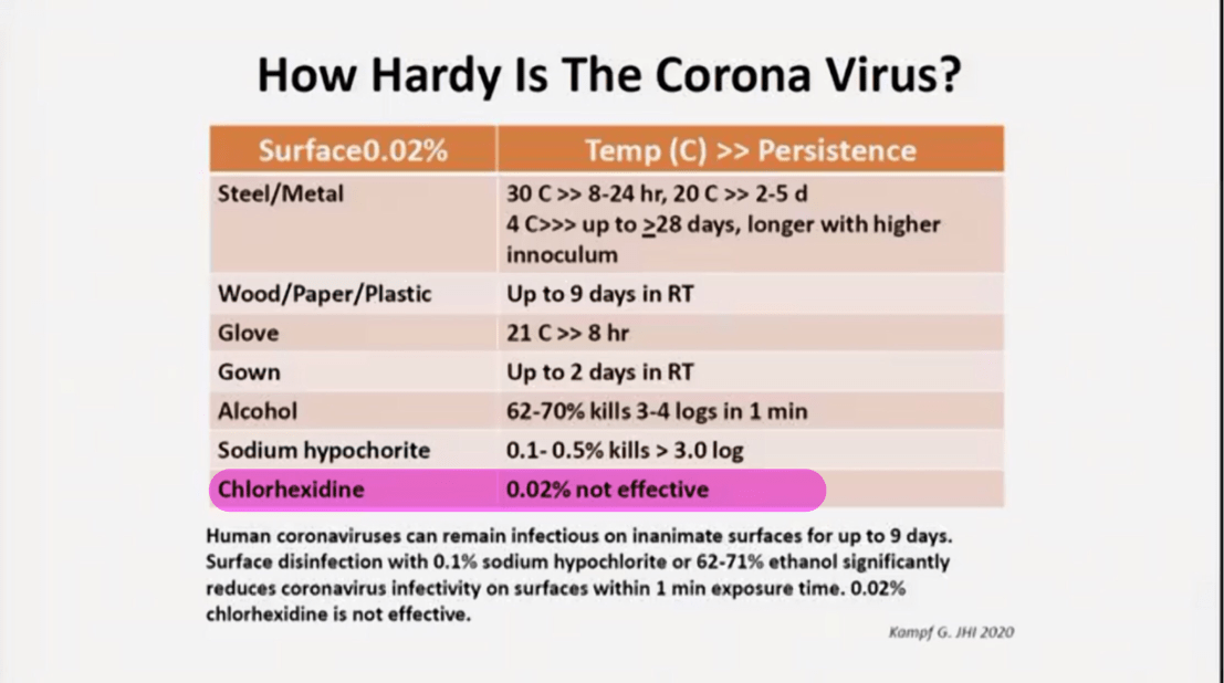 แสดงการศึกษา CHX ที่เป็น Disinfectant นะครับ ไม่ใช่ Antiseptic (เป็นวิธีใช้ทำความสะอาดพื้นผิววัตถุ ไม่ใช้ในมนุษย์) จะเห็นว่า ใช้ CHX ที่ความเข้มข้น 0.02% ซึ่งต่ำกว่า form ที่เป็น mouth wash ถึง 6 เท่า (= 0.12%/0.02%) ตอนที่อ่านเจอทำให้ผมสงสัยว่า เพราะ ความเข้มข้นที่ต่ำเกิน จึงอาจไม่ effective ต่อกลุ่ม Coronavirus
