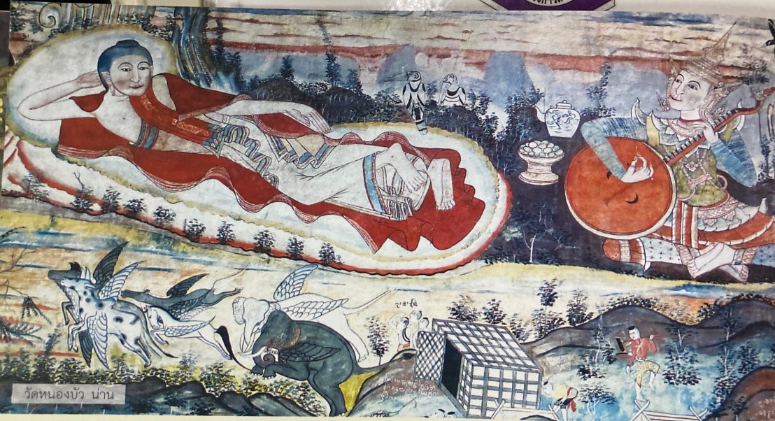 ” วันหนึ่ง เมื่อพระชนม์ได้ ๓๕ พรรษา พระอินทร์ทรงลงมาดีดพิณ ๓ สายให้ฟัง