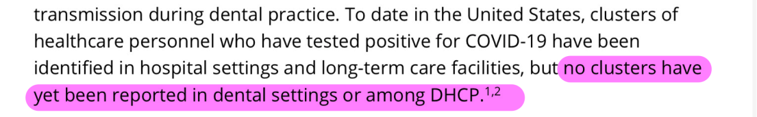 แม้มีการติดต่อจากการทำงานในผู้ป่วยไปสู่ Health Care Personal เป็นจำนวนมาก แต่จนถึง ณ วันที่ CDC update paper นี้ ยังไม่พบว่า มี cluster ของผู้ติดเชื้อจากงานทันตกรรมเลย ทั้งในส่วนของผู้ป่วย และ DHCP ใน US