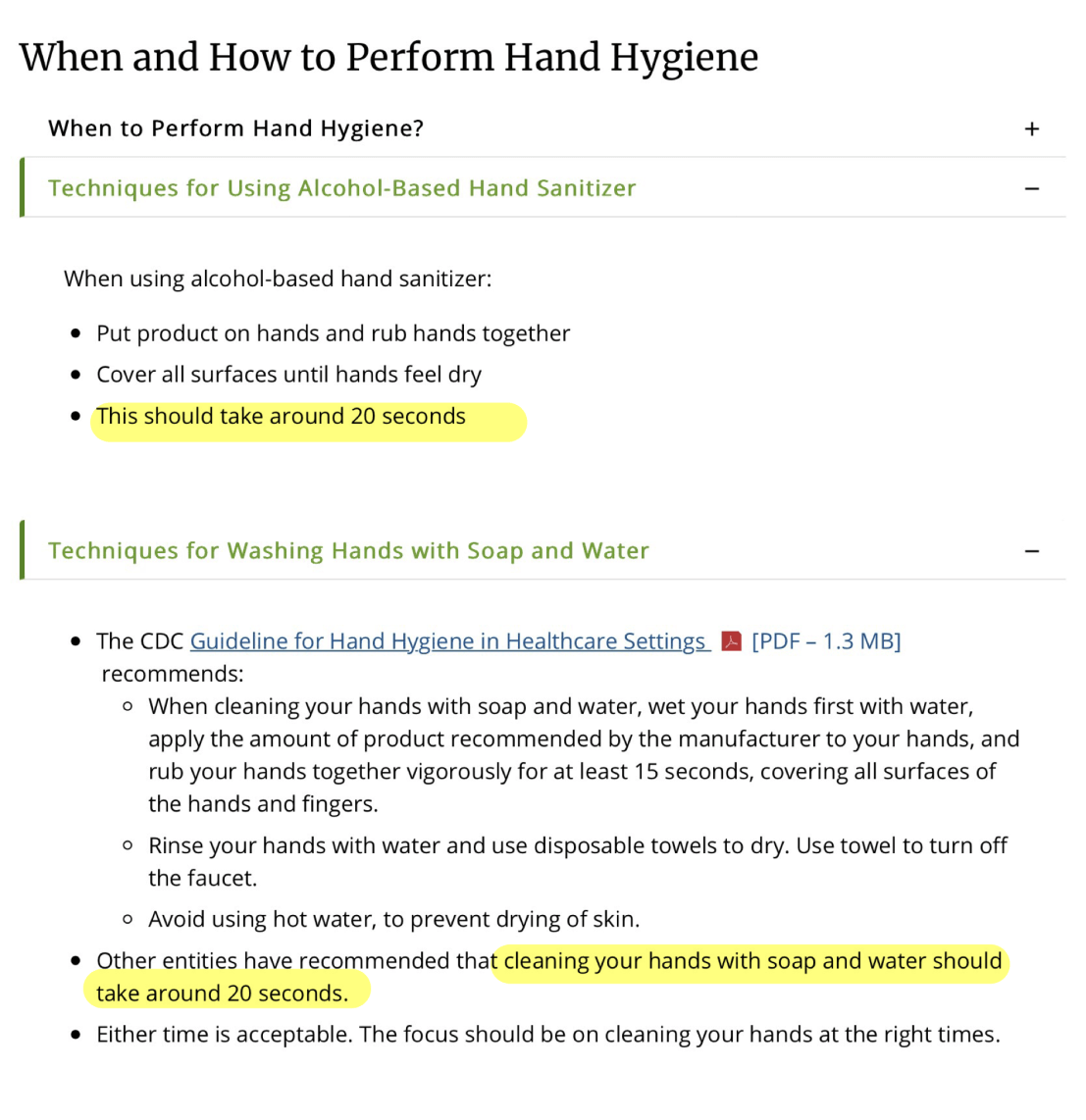 ไม่ว่าจะใช้ ABHR หรือ น้ำ+สบู่ จะใช้เวลา 20 s สำหรับหัตการทั่วไป แต่ถ้างาน surgery ใช้เวลา 2-6 นาที (เวลาที่เพิ่มขึ้นมาคือให้ใช้ antiseptic soap scrub)