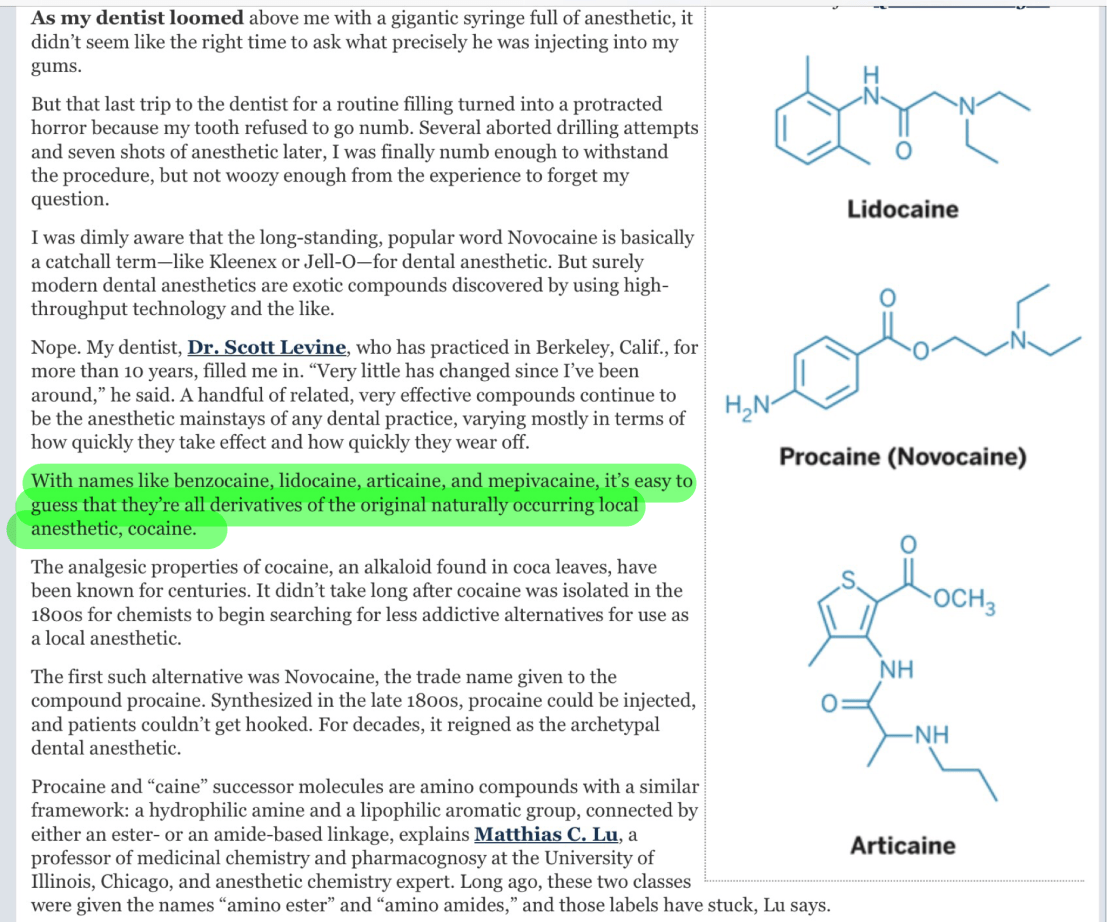 อารมณ์ประมาณ ถ้าไปพบหมอฟันแล้วโดนฉีด Lidocaine หรือ ป้าย Benzocaine topical แล้วไปตรวจ urine วันรุ่งขึ้น อาจเจอสารเสพติดเหมือนคนเสพ Cocaine ได้