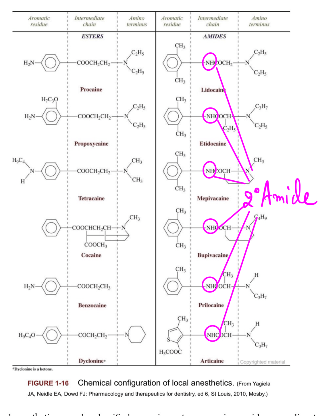 LA ในรูป injectable ทุกตัว (ไม่ว่าจะเป็น Amino esters หรือ Amino amide) เป็น Tertiary amine ทั้งหมด (ยกเว้น Prilocaine และ Hexylcaine จะเป็น Secondary amine)