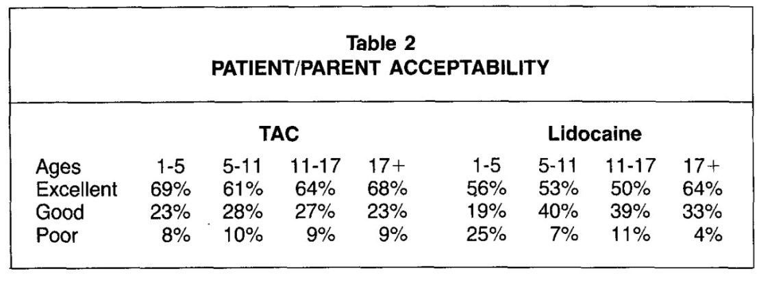การศึกษาของ Dr.Pryor เป็นการเปรียบเทียบประสิทธภาพของยาชา TAC เทียบกับยาชาชนิดฉีด Lidocaine 1% with epinephrine 1: 100,000 (0.001% w/v) กับผู้ป่วยเด็ก อายุ 1 ปีขี้นไป ที่เข้ามารักษาแผลในแผนกฉุกเฉิน ช่วง ตุลาคม-ธันวาคม ค.ศ.1979 จำนวน 158 คน โดยแบ่งจำนวนผู้ป่วยอย่างละครึ่ง คือ ครึ่งนึงใช้ TAC ทำให้ชาก่อน suture ส่วนอีกครึ่งใช้ Lidocaine 1% with epinephrine 1: 100,000 ฉีด SubQ ก่อน suture wound