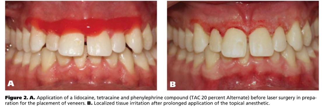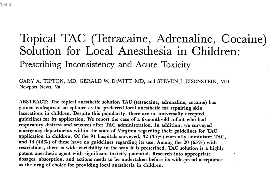 ปกติในช่วงนั้นการใช้ Topical LA repair minor laceration จะใช้สำหรับการฉีกขาดสำหรับ mucosal surface ถ้าจะใช้กับ skin ต้องทำ local infiltrate, nerve blocks, regional blocks เท่านั้น (เพราะ skin มี barrier ต่อยาชาในรูป topical มากกว่า mucosa)