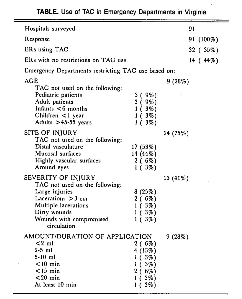 การใช้ TAC ใน paper ใช้ในรูปสารละลายที่ชุบ gauze ขนาด 2″วางทาบบริเวณแผลโดยเพิ่มขนาดความยาว gauze ตามความยาวแผล วางไว้ประมาณ 10 นาที จึงเริ่ม suture