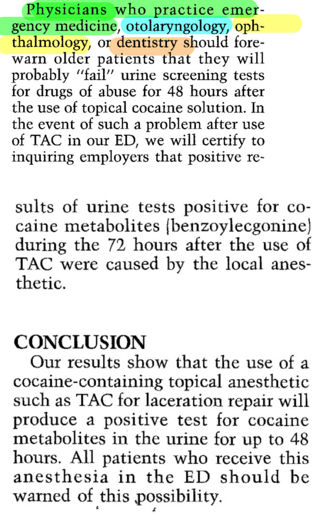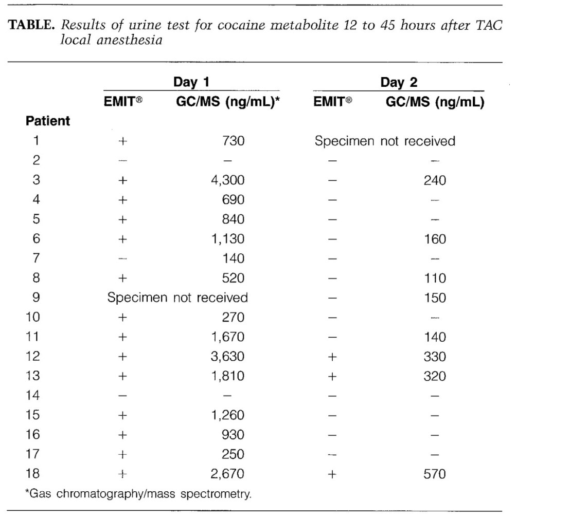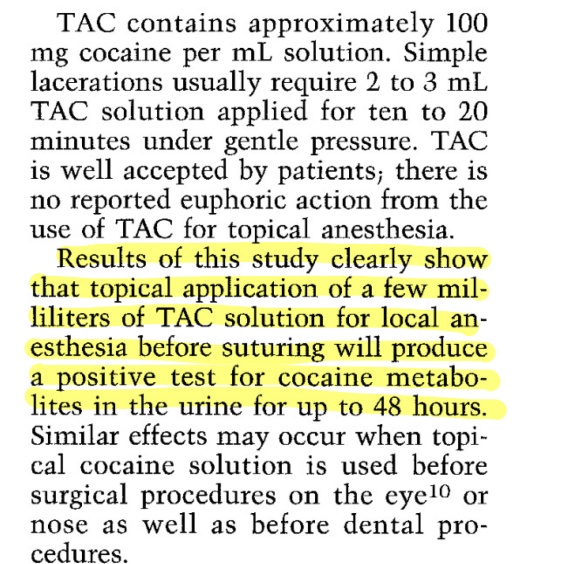 พบว่า แม้ใช้ TAC เพียง 2 ml ชุบ cotton ball แล้วกดบริเวณเนื้อเยื่อแผลให้ชาก่อน suture ก็ทำให้ตรวจพบสาร metabolite ของ Cocaine คือ benzoylecgonine โดยการตรวจ urine ด้วยวิธี Enzyme immunoassay ที่ cut-off point 300 ng/ml (แล้วจึง confirm ด้วยวิธี Gas chromatography, Mass spectrometry ซึ่งมี specificity สูงกว่า ที่ cut-off point ที่ต่ำกว่า) ได้ถึง 2 วันหลังจากนั้น