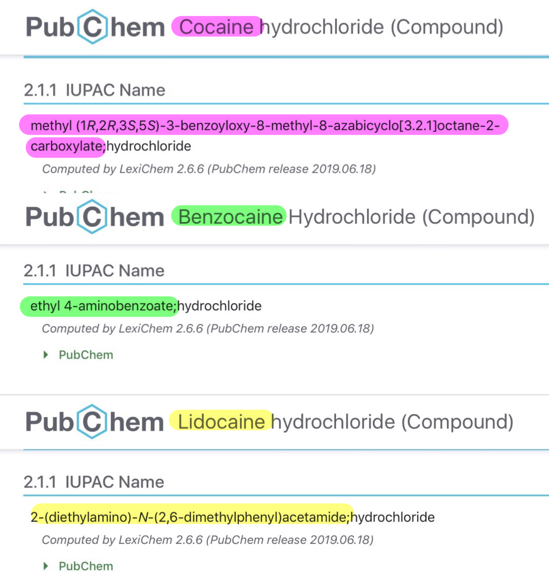 ยกตัวอย่าง Common name กับ IUPAC name ของ Cocaine, Benzocaine, Lidocaine