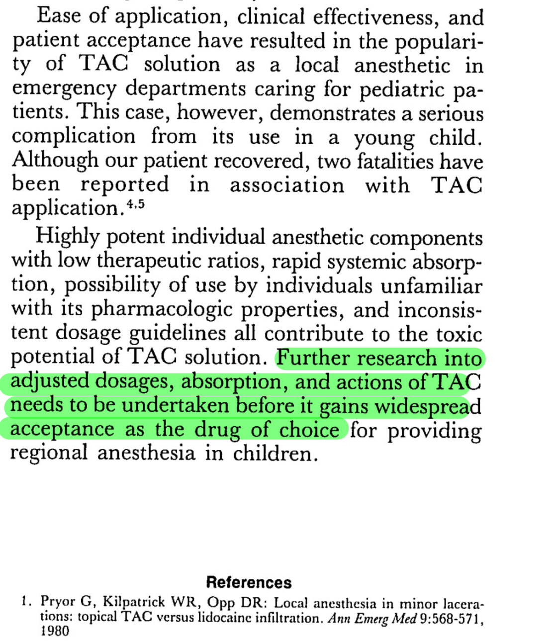 แต่ที่ Madigan AMC พบว่า สามารถนำ TAC มาใช้แทน LA แบบฉีดในการซ่อมแผลที่ skin ในเด็กเล็กที่ไม่ค่อย coop ต่อเข็มฉีดยาได้ (ใน paper Dr.Pryor ใช้คำว่า ใช้ TAC มาหลายปีก่อนหน้านี้ แสดงว่าใช้ก่อนหน้าปี ค.ศ. 1979)