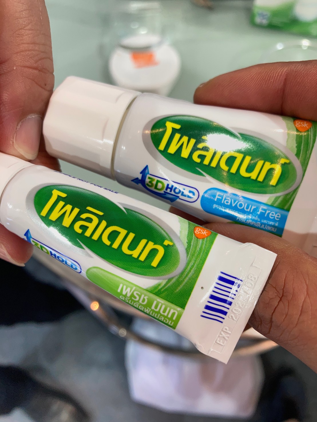 เทียบกัน บริษัทบอกว่า Research แล้วพบว่า คนไข้ elderly จำนวนมากไม่ชอบรสและกลิ่นของ Denture cream ครับ เลยพัฒนาตัวนี้ขึ้นมา