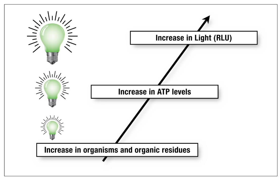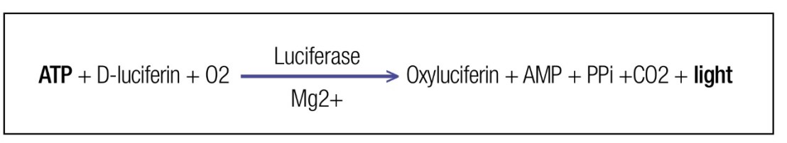 หลักการคือ ในเซลล์ของ bacteria มี ATP เป็นแหล่งพลังงาน (Krebs cycle 1 วงรอบได้ 38 ATP) ถ้ามีการปนเปื้อน เราใช้ enzyme ตัวนึง (luciferase) ทำปฏิกิริยาร่วมกับสารตั้งต้น (D-luciferin) จะได้ Light ออกมา ตามสมการ