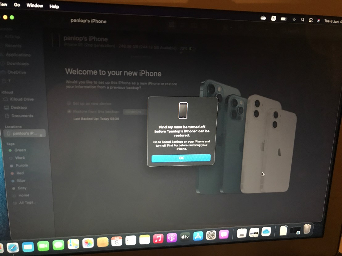 มี pop up ที่ Macbook ให้ปิด Find My ก่อนเริ่ม Restore from backup