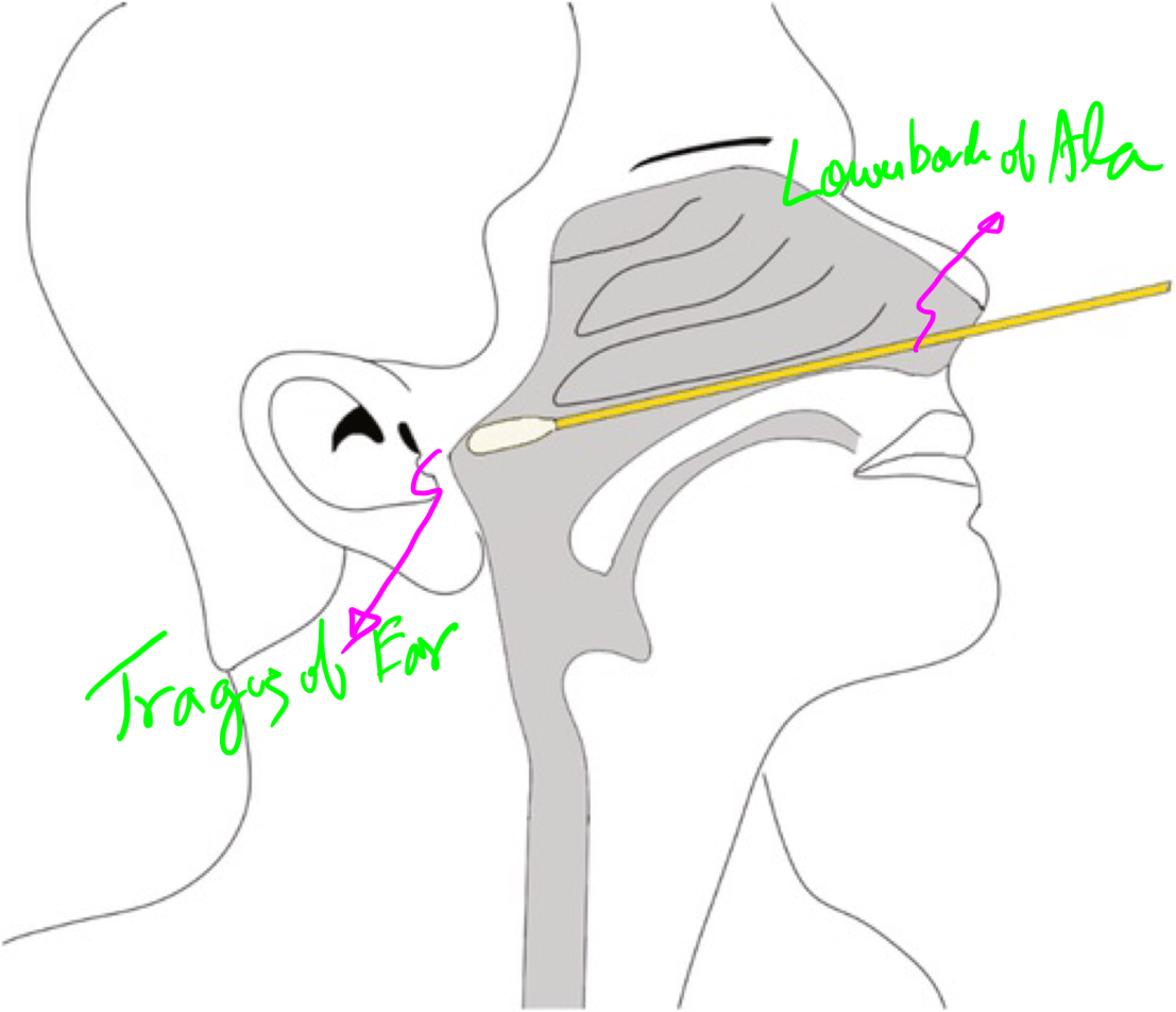 ดังนั้นการทำ NP swab ที่ปลอดภัยที่สุดคือ ให้ Pt หัน Sagittal view เข้าหาเรา แล้วใช้มือซ้ายประคองศรีษะไว้ จากนั้นใช้มือขวา swab โดยใช้แนว Camper’s line เป็น guide ด้วยความนุ่มนวล ในระยะที่ถูกต้อง (ทำให้ถึง Pt จะเงยหน้าเล็กน้อย เราก็ไม่หลง plane ครับ)