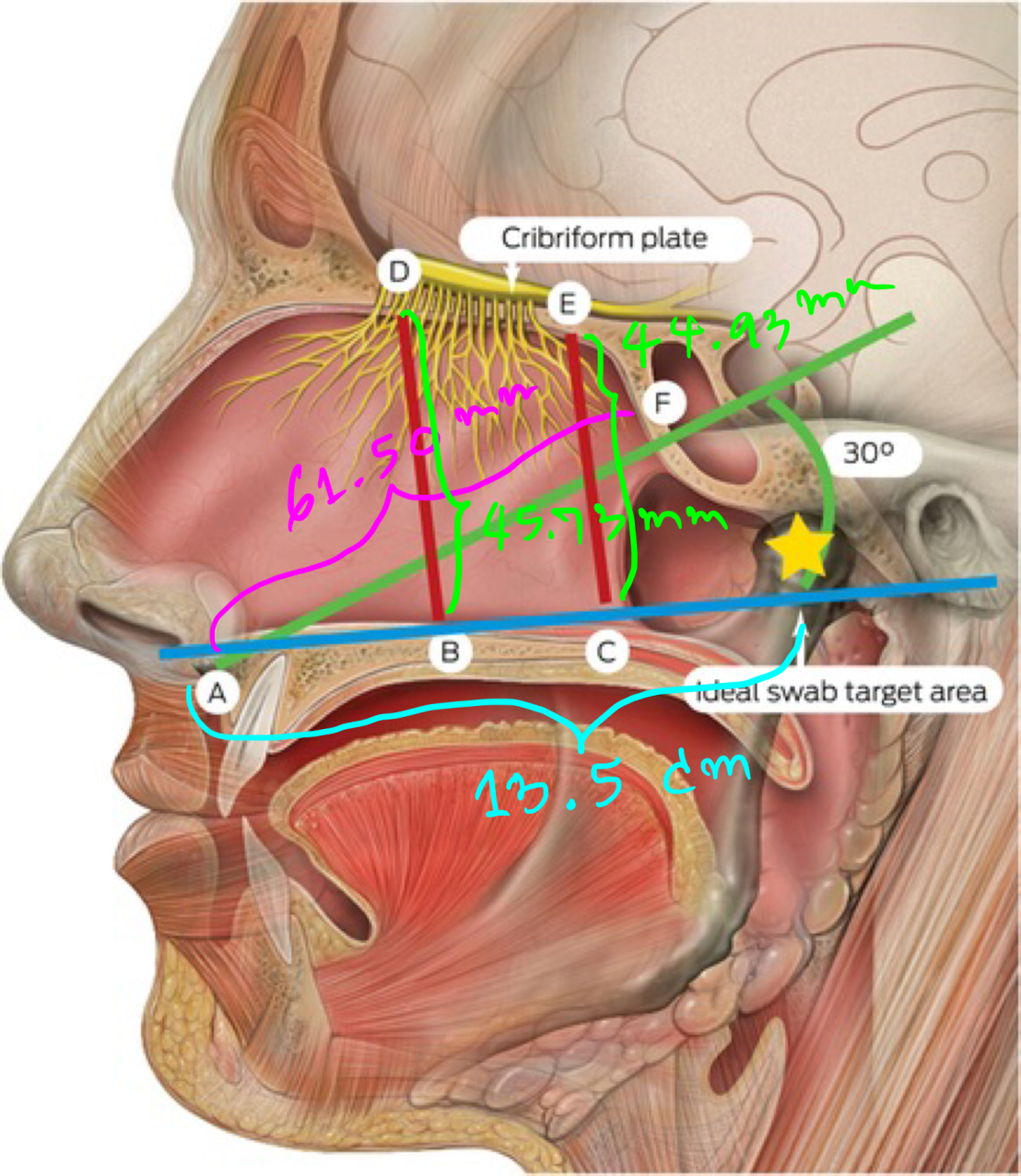 จุด F คือ Sphenoid ostium opening เป็นจุดเริ่มต้นของ Danger zone ที่จะเข้า Skull base ด้วยระยะ 13.5 cm ที่ปลาย swab เข้าถึง