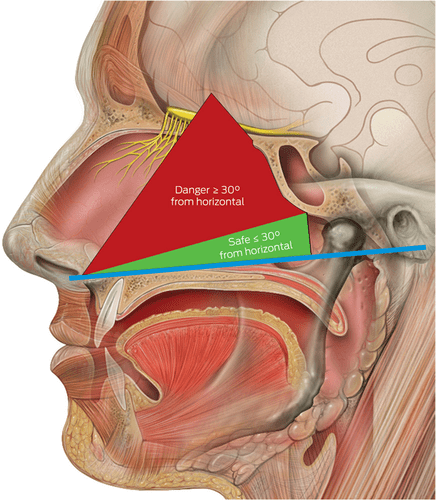 (คือ ถ้าสูงกว่า 30° จะเข้าส่วนที่บอบบางของ skull base ทันที)