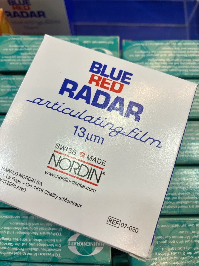 อันนี้ผมเพิ่งเห็นครับ Radar articulating paper ขนาด 13 μm (ปกติผมใช้ของ Homedent สีแดงแบบหน้าเดียว กับ shimstock)