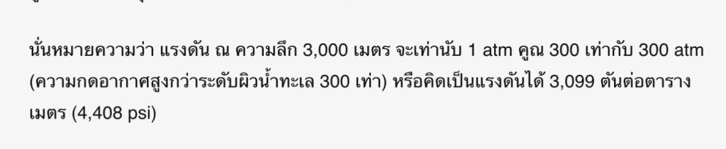 แรงดันจะเพิ่มขึ้น = 3,000/10 = 300 เท่าของที่ระดับผิวน้ำทะเล