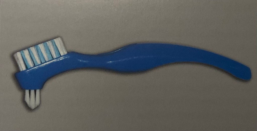 รูปแสดง แปรงทำความสะอาดฟันปลอมโดยเฉพาะ ที่มีหัวแปรง 2 แบบ หัวที่กว้างใช้แปรงผิวทั่วไป ส่วนหัวเล็กใช้แปรงบริเวณซอกเล็กๆ