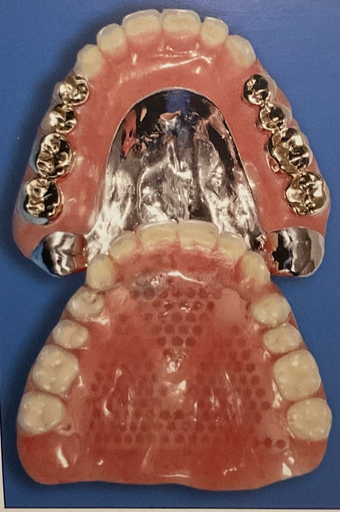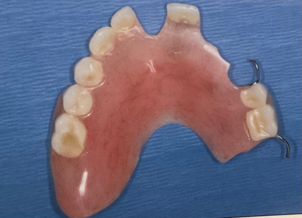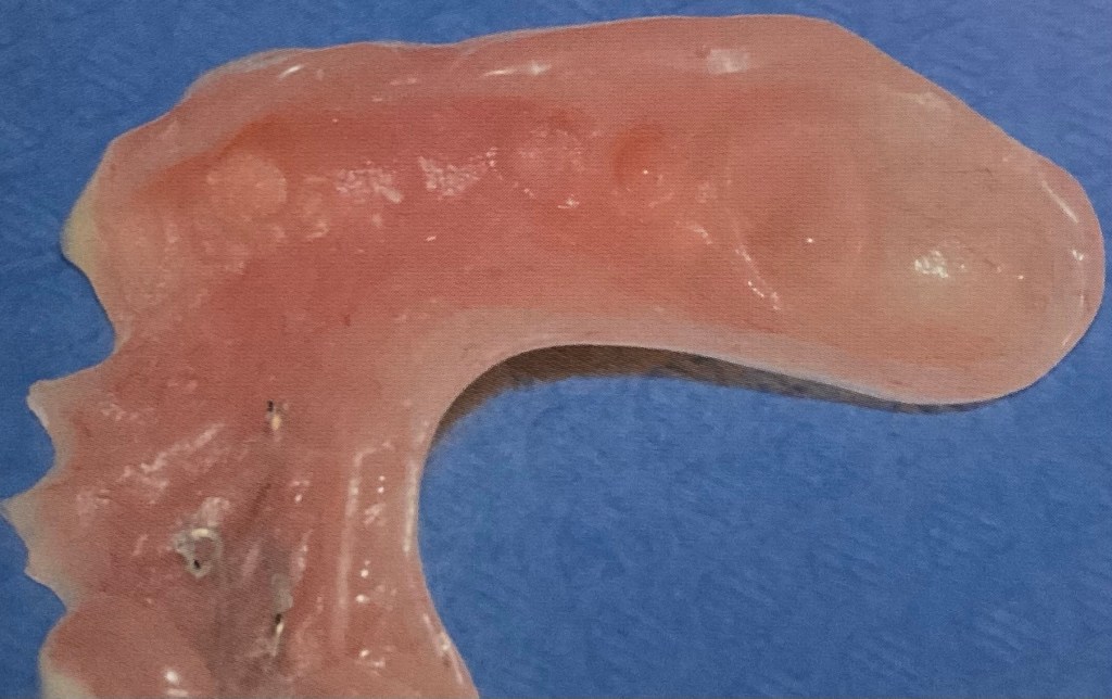 แสดงฟันปลอมชนิด ฐานอะคริลิค อีกชิ้น เป็นชิ้นฟันบน จะสังเกตว่า ด้านล่างฐานฟันปลอมจะมีลักษณะขรุขระ ผิวไม่เรียบ ซึ่งจำลอง ลอกเลียนรายละเอียดตามรูปร่างเหงือก และ เพดาน ของผู้สวมใส่แต่ละคน