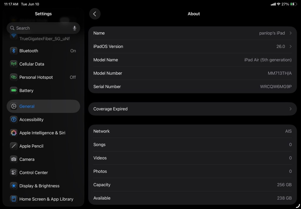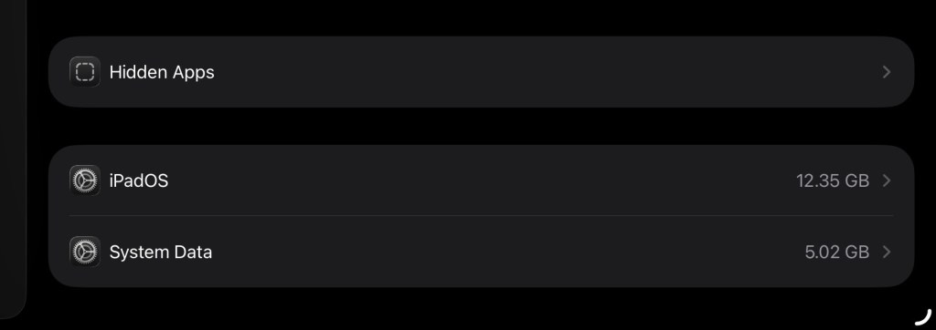 พื้นที่ของ iPad OS 26 ที่ใช้ storage ของเครื่อง ตอนที่เป็นเครื่องเปล่า
