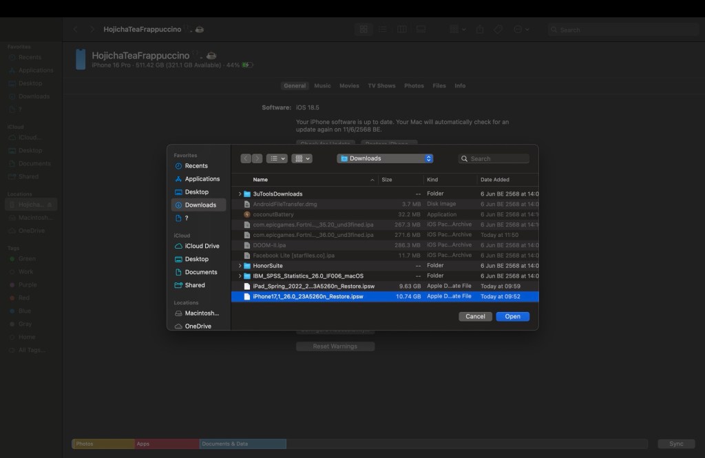 หลังจากนั้นที่ Finder (หรือ iTunes) ใช้คำสั่ง option + restore เพื่อชี้ไปใน firmware ที่ download มาได้