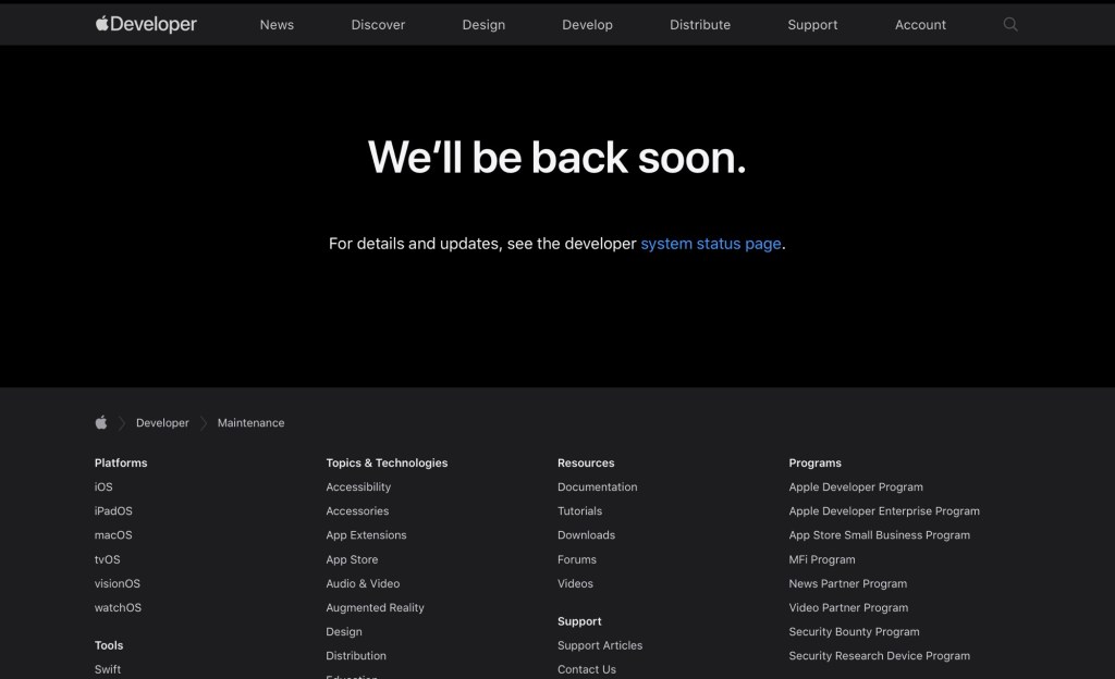 ดูจากช่วงหัวค่ำ เวบ Dev Apple ขึ้นแบบนี้ครับ