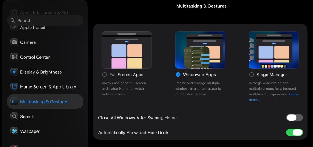 แสดงการตั้งค่า multitasking แบบใหม่