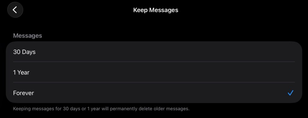 ไปที่ Settings (การตั้งค่า) –> Messages (ข้อความ) –> Message History (ประวัติข้อความ) –> เลือก ‘Forever’ (ตลอดไป)