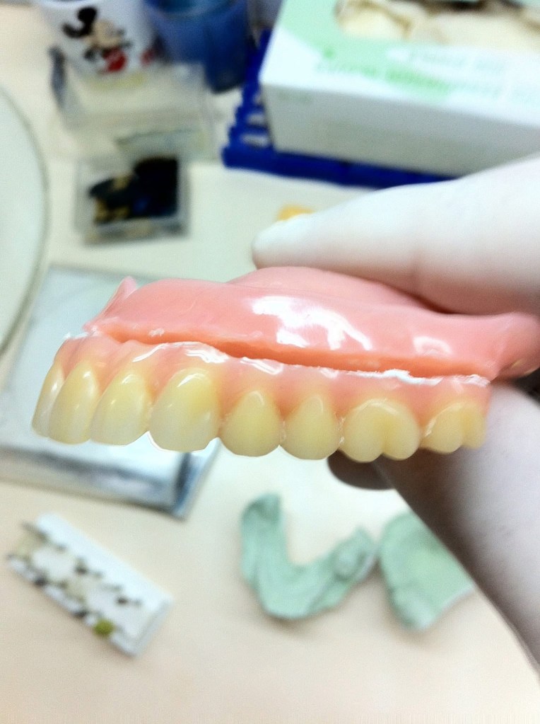 วิธีแก้ไข ในตอนนั้นคือ ใช้ Plaster Knife งัดแยกออกมาเลย จะออกมาแบบแตกๆ ครับ แล้ว ห้ามให้ ชิ้น Plaster ที่แตกหลุดออกมาเด็ดขาด เพื่อเวลา pack acrylic เข้าไป แล้วประกบ Flask ตามเดิม –> เข้า Hydraulic flask press ค่า VD จะต้องไม่เปลี่ยน