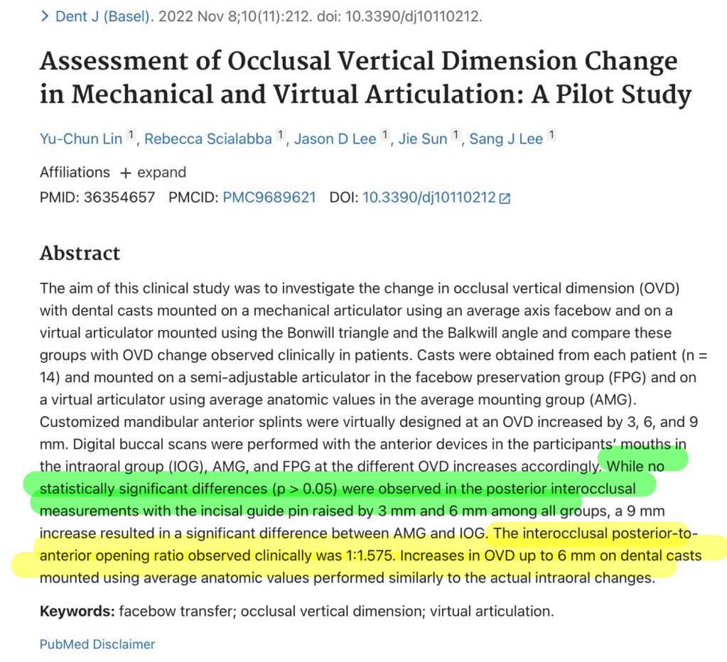 paper นี้เลย ต้องการดูว่า ถ้านำค่า Facebow เฉลี่ย มาใช้กับ Virtual articulator ค่า VD จะเพี้ยนมั๊ย? เมื่อเทียบกับการวัดจริง ในคลินิก (คล้ายๆ ที่เราใช้กัน เหมือนค่าเฉลี่ยใน hanau ด้วยสูตร L = H/8 + 12 ที่เราใช้ปรับมุม Condyle) โดย null คือ ค่าที่ออกมาไม่น่าจะแตกต่าง