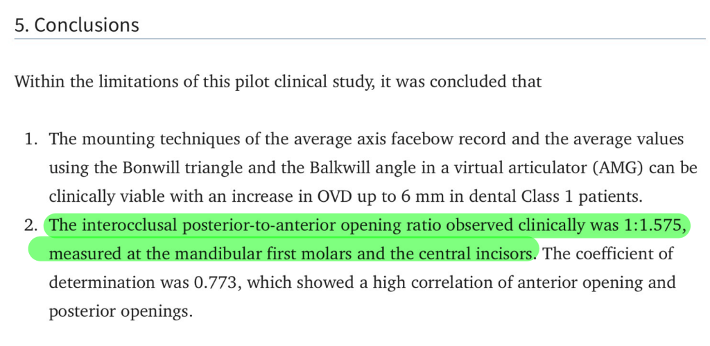 หมายความว่า ถ้าเรา selective grinding ฟันหน้า 1.5 มม. –> ฟันหลังจะลงเพียง 1 มม. (and vice versa)